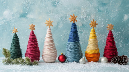 Christmas trees in various colors and decorations, set against a snowy background. Christmas decor and craftwork, eco friendly, sustainable, zero waste concept.