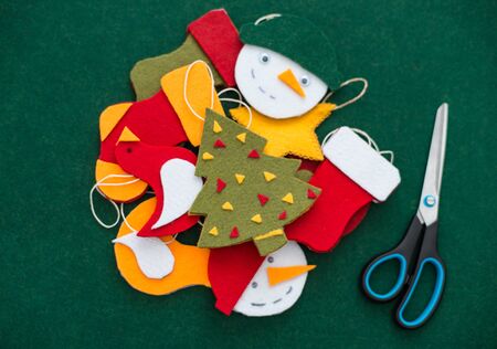 Making of handmade christmas toys from felt with your own hands. Children's DIY concept. Making xmas tree decoration or greeting card