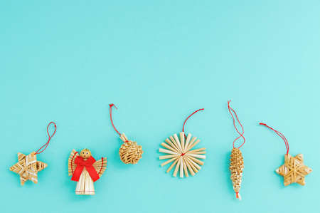 Christmas decoration made of straw and a figurine of an angel with a red bow on a turquoise background.
