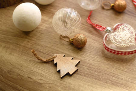 Concept of making Christmas gifts with small boxes and decorations for the Christmas tree. Box with a small wooden decoration ready for packaging