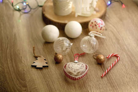 Christmas composition. Red and white decor elements that are used to decorate the Christmas tree. Winter, New Year's concept