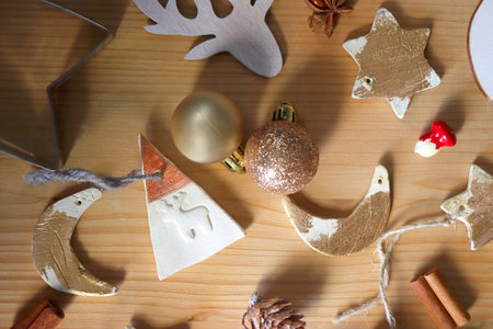 Wrapping christmas gift. Modern authentic Christmas ornaments. Stylish handmade clay tree, star and mushrooms with scissors and thread on rustic table. Winter holiday preparation