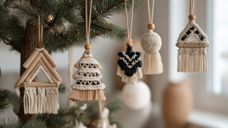Discover the beauty of handmade macrame ornaments elegantly hanging from a Christmas tree, offering unique designs and cozy textures perfect for festive home decor.
