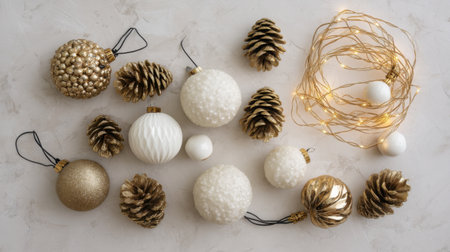 A beautiful assortment of decorative Christmas ornaments and pine cones in gold and white colors, perfect for holiday celebrations and festive decor inspiration.