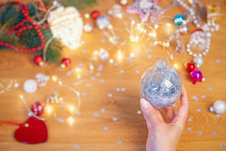 Christmas New year composition with toys on the old wooden background.Top view with copy space
