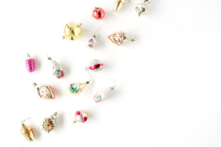creative arrangement of bright christmas balls and toys on white background. flat lay, top view