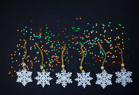 Various Christmas ornaments and colorful sequins on dark background. Selective focus.