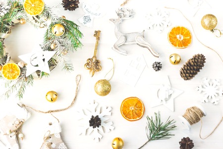 Christmas tree ornaments in neutral and gold colors, illuminated by sunlight. Flat lay.