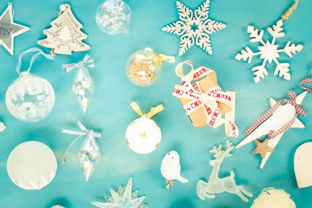 Blue and white christmas - styled christmas composition flat lay style top view, retro toned