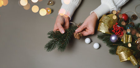 Woman making Christmas wreath, top view. Florist hands creating festive decoration. Christmas wreath workshop with copy space, banner. Top view