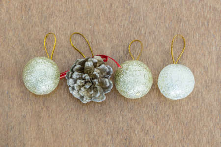 Various wooden Christmas ornaments, golden baubles and pine cones on wooden background. Selective focus.