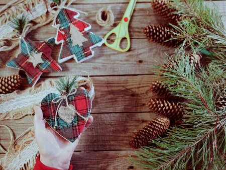Female elderly hands are busy making New Year's toys. New Year's composition on a wooden background with pine branches, cones, handmade New Year's toys. Pine branches, rope, toys and scissors. New Year greetings background.