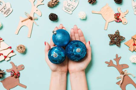Top view of a heap of New Year balls in female hands on blue backround made of festive decorations. Christmas time concept.