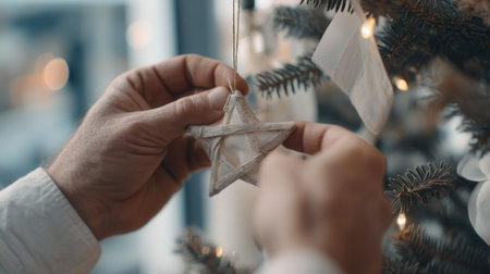 Close-up of a man's hands hanging a white star ornament on a Christmas tree. The scene creates a cozy and festive atmosphere, embodying holiday traditions and warmth. Ideal for seasonal content.