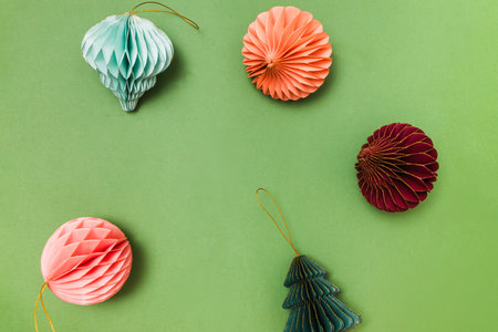 Top view Banner of green background with New Year toys and decorations. Christmas time concept with copy space.