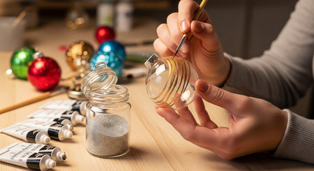 A close-up image showcasing a hand holding a paintbrush as it delicately paints a pinecone. Surrounded by Christmas ornaments and vibrant greenery, this festive scene captures the creativity of holiday crafting against a stylish gray backdrop.
