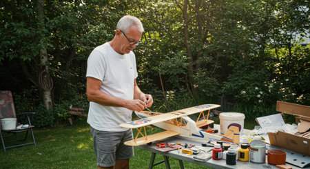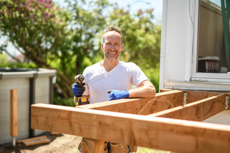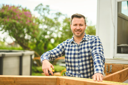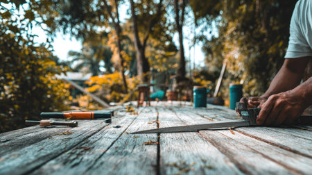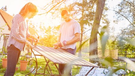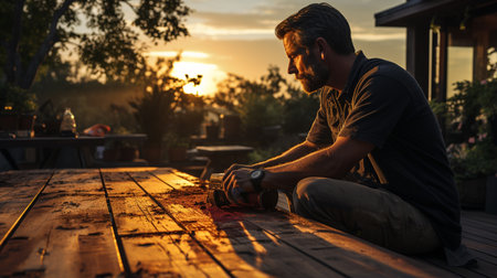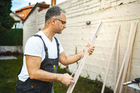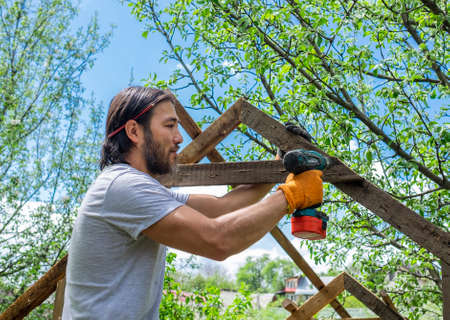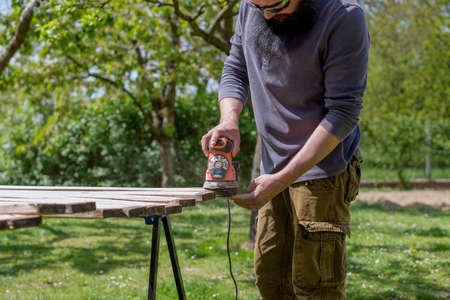 Mid adult caucasian man in the garden sanding wooden planks. DIY home improvement, restoration, carpentry concept.