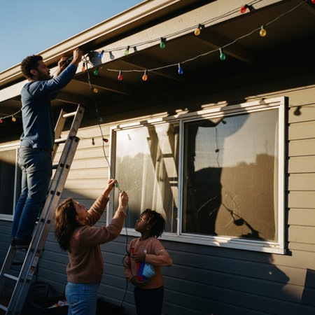 A father and son working together to install plywood over windows in preparation for a hurricane.