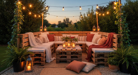 table for lunch outside in the garden in the courtyard with the lights of a country house at sunset. landscape design in the cottage.