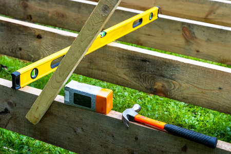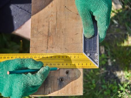 Low angle view of a worker with protective gloves marking a spot on wooden plank while placing it on a foundation for outside patio. Renovation and diy project.