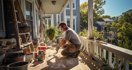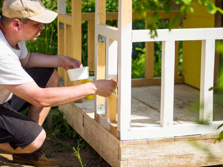 a man paints the terrace with a brush with white paint. dad makes a children's house or hut for his daughter