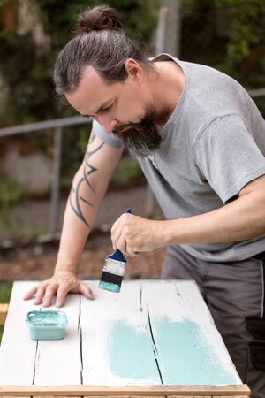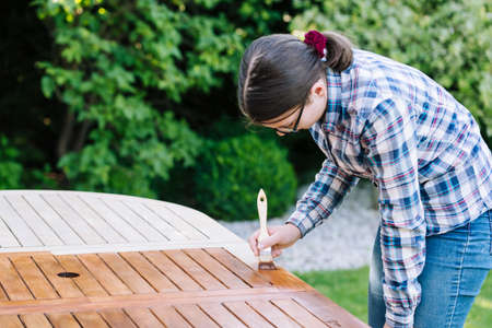 young woman painting wooden exotic wood table in the garden with a brush - shallow depth of field