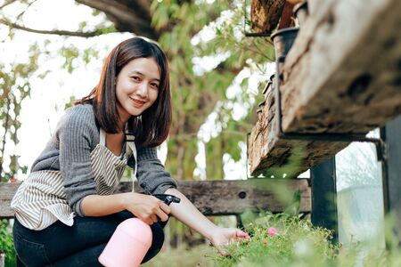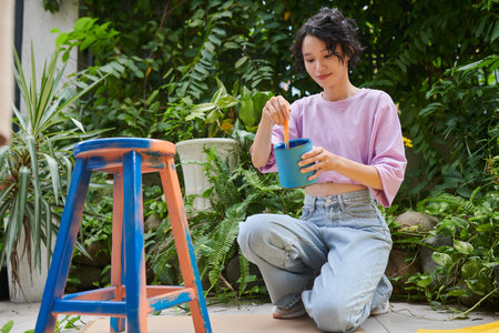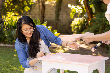 Painting small table, asian woman smiling and enjoying outdoor DIY project. furniture, creative, enjoyment