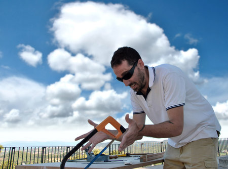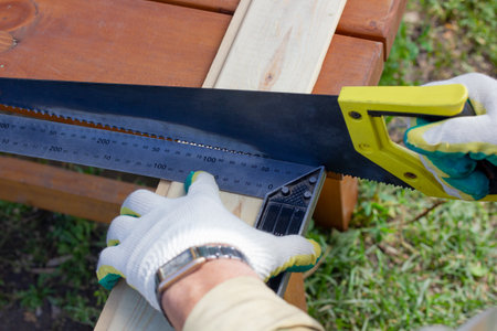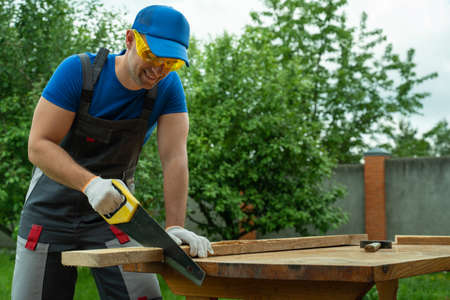 Male carpenter with a saw with protective tools sawing hand saw wood
