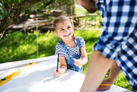 Boy assisting his father in DIY activities in the backyard of countryhouse