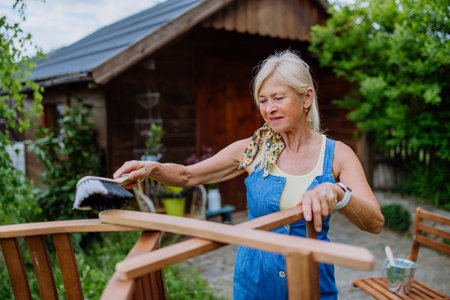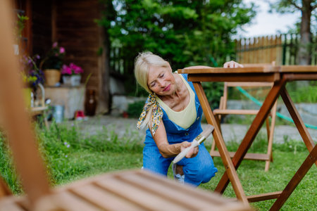 Senior woman cleaning and renovating garden furniture and getting the garden ready for summer