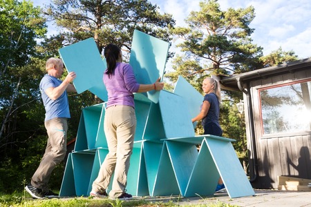 Carpenter or DIY homeowner building a wooden hut outdoors in the garden fitting the window and door frames viewed through a window opening.