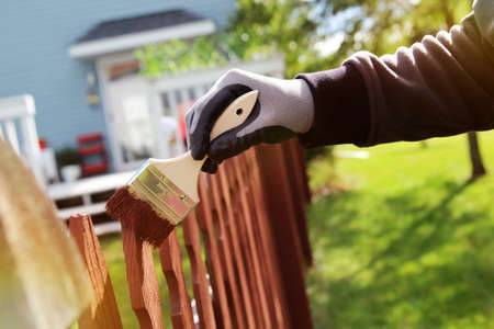 Young man worker paints with a brush a wooden board fence gate. DIY, Do it yourself concept. House improvement. Home renovation and refurbishment. Selective focus, copy space.