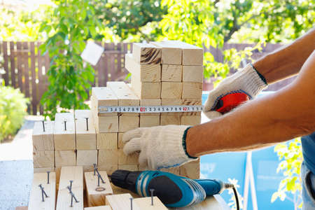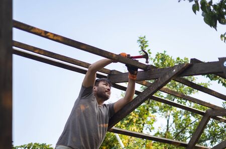 A master carpenter is screwing in large screws to fasten the frame and floor in the gazebo, assembly work of a wooden gazebo.