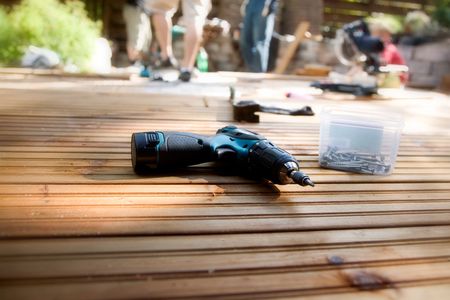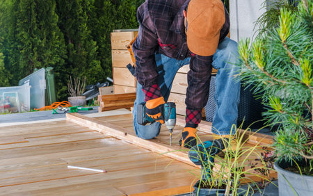 A person is kneeling on a partially finished wooden deck, using a power drill to secure the boards. Lush greenery surrounds the work area, indicating a spring setting.