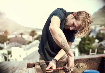 Getting some repairs done. Cropped shot of a handsome young man working outside on his roof.