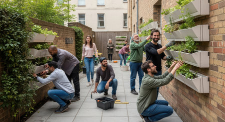 Two workers repair a wooden bench with a power jigsaw on a sunny urban scene