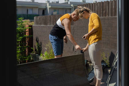 Couple moving in new home house, assembling furniture sofa for terrace, working together, wife help to husband