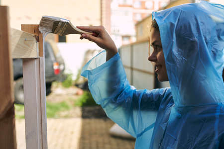 Young woman as a craftsman trainee with paint can for painting wooden fence in the garden