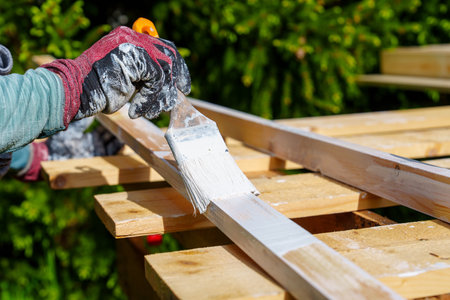 Painting Wood Planks with White Paint for Outdoor DIY Project. Skilled Craftsmanship