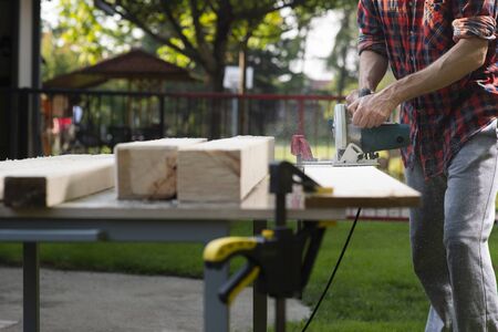 Carpenter using circular saw cutting wooden boards with hand power tools