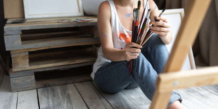 Creative painter in working process. Artist workplace, hobby, craft tools. Artist female canvas painting. Professional young woman painter draws in the workshop. Leisure activity. Art at home