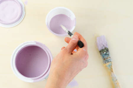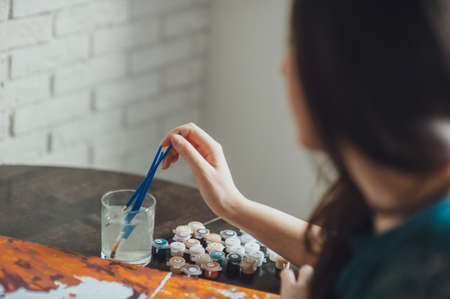 Painting on canvas by numbers and numbered jars of paint. Woman draws with a brush painting by numbers on canvas. Creative hobby. Painting for beginners. Leisure activity for stay home lockdown, anti-stress idea. Meditation, relax concept