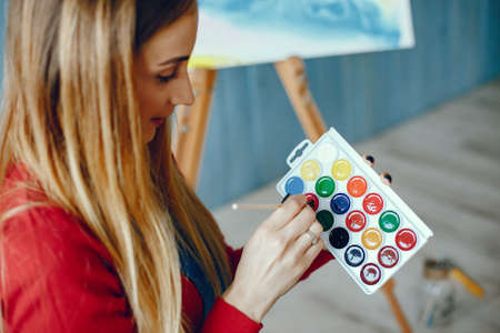 young beautiful girl with long hair draws a picture paints