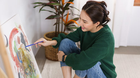 Creative of art concept, Young asian woman sitting on the floor to painting artwork in art studio.