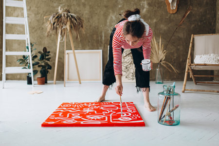 Artwork in process. Artist talent and style. Relief pattern canvas on floor. Woman with brush.