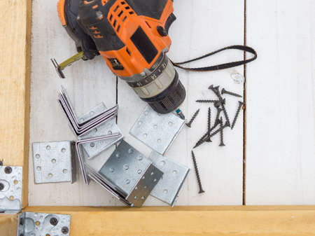 screwdriver, self-tapping screws and metal corners in the workplace, the concept of assembling a wooden house