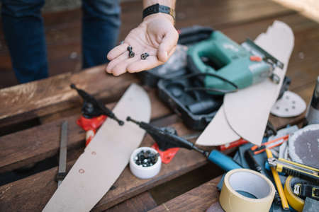 Mans hand holding screws and screw nuts over blurred tools. Close-up of male hands holding skateboard bolts and nuts above table with tools and parts.