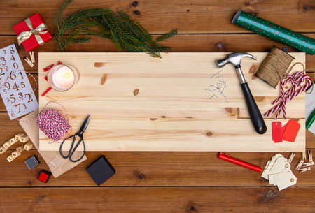 Merry Christmas and Happy New Years Handy Constrcution Tools background concept. Handy House Fix DIY handy tools with Christmas ornament decoration on a grunge white wooden table.
