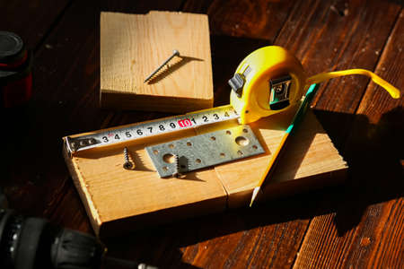 measuring tape pliers pencil screwdrivers and a board on the carpenter's workbench. High quality photo
