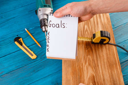 New Year goals for 2022, plumbing tools and notebook in workshop.